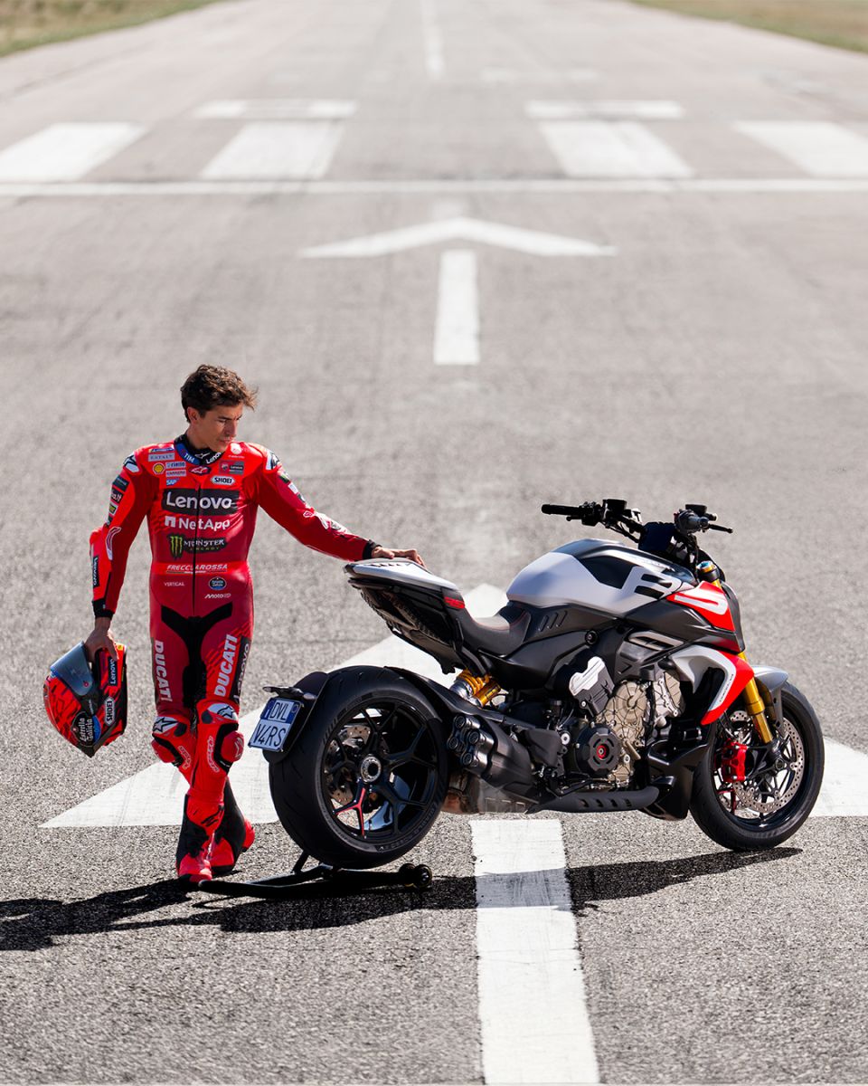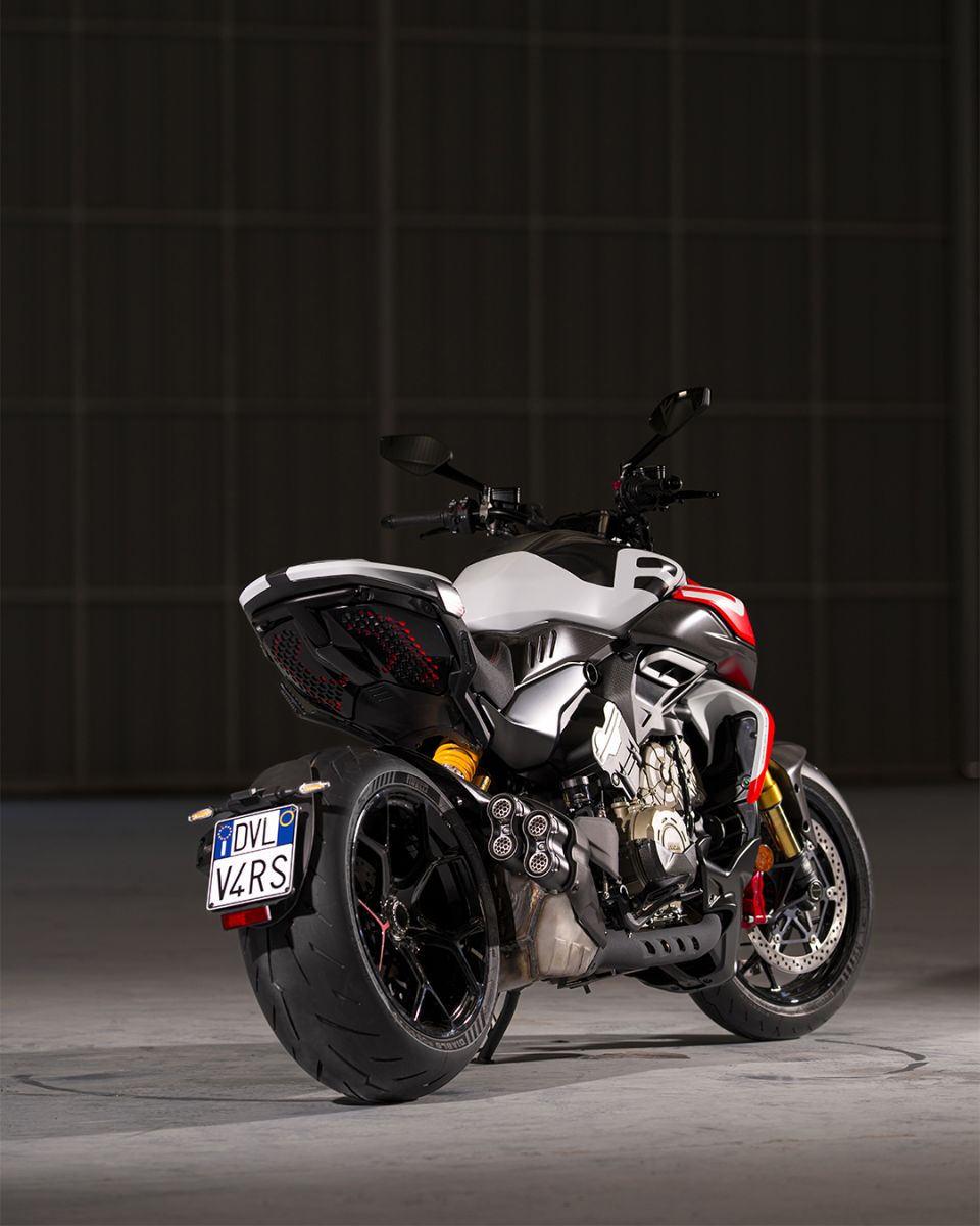 Diavel V4 RS vyniká svojím odvážnym dizajnom, v ktorom bol prepracovaný každý prvok: od prívodov vzduchu cez jednosedadlovú zadnú časť až po blatníky a kryty nádrže, všetko vyrobené z uhlíkových vlákien. Úplne nové kované kolesá s päťlúčovým dizajnom v tvare „Y“ dodávajú Diavelu V4 RS silnú vizuálnu a dynamickú identitu. Jednostranná hliníková kyvná vidlica dizajn vylepšuje a zdôrazňuje. Diavel V4 RS stelesňuje ducha Ducati Muscle Roadster a pridáva technické a štýlové riešenia, vďaka ktorým je nezabudnuteľný.