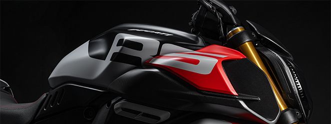 Diavel V4 RS sa vďaka vývoju nového dizajnu pýši športovejším a asertívnejším profilom. Nové kompozitné vetracie otvory na ramenách nádrže kombinujú viditeľné uhlíkové vlákna v spodnej časti s červenou vrchnou povrchovou úpravou, čím vytvárajú výrazný kontrast. Bočné panely, ktoré ladia s karosériou, zdôrazňujú mohutnú silu prednej časti a zvýrazňujú vizuálny dojem motocykla.